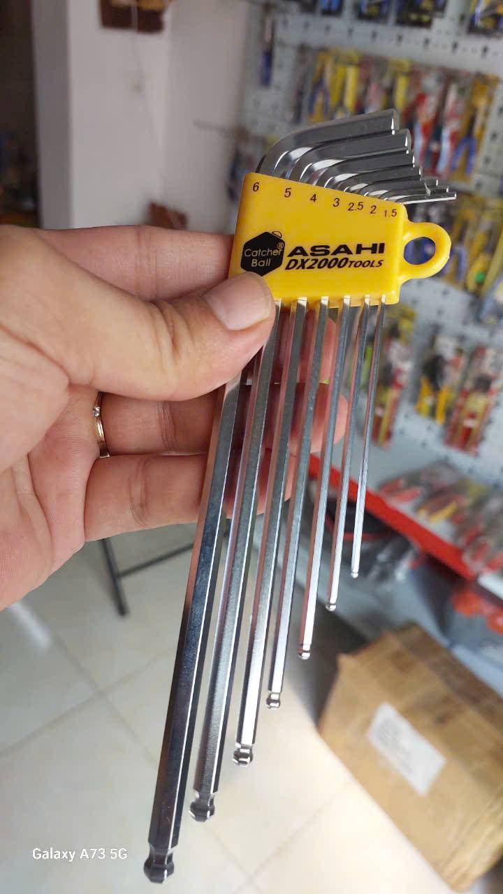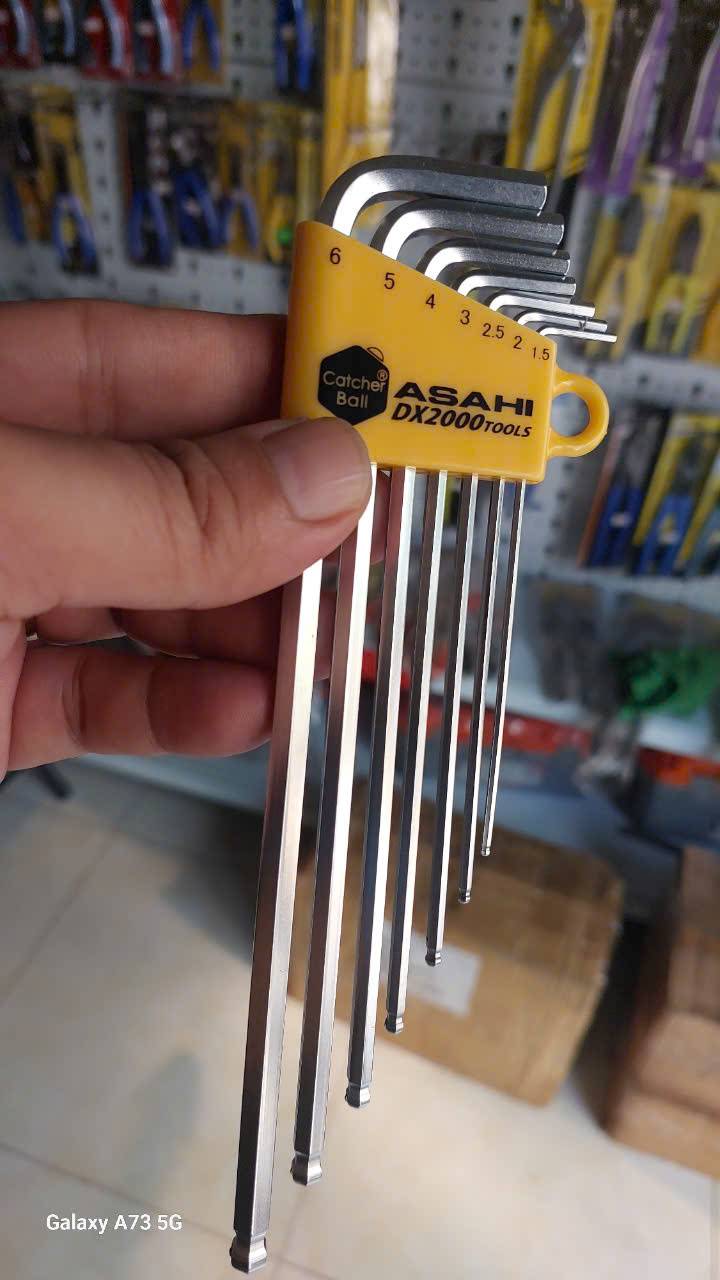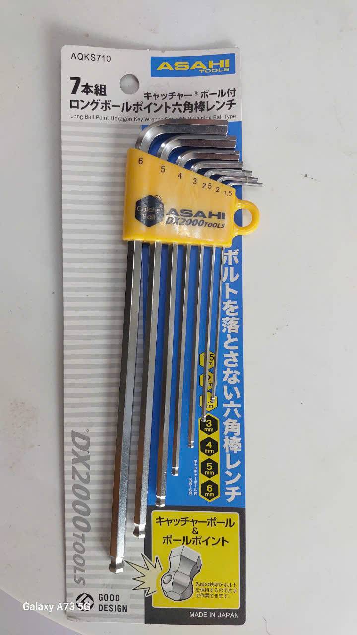 Bộ lục giác bi loại dài 1.5-6mm Asahi AQKS710 là bộ dụng cụ cao cấp 7 chi tiết được sản xuất tại Nhật Bản, chuyên dùng để vặn, siết bu lông và vít đầu lục giác chìm trong lắp đặt máy móc và thiết bị công nghiệp.