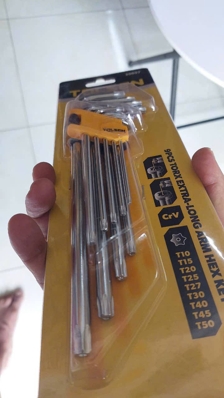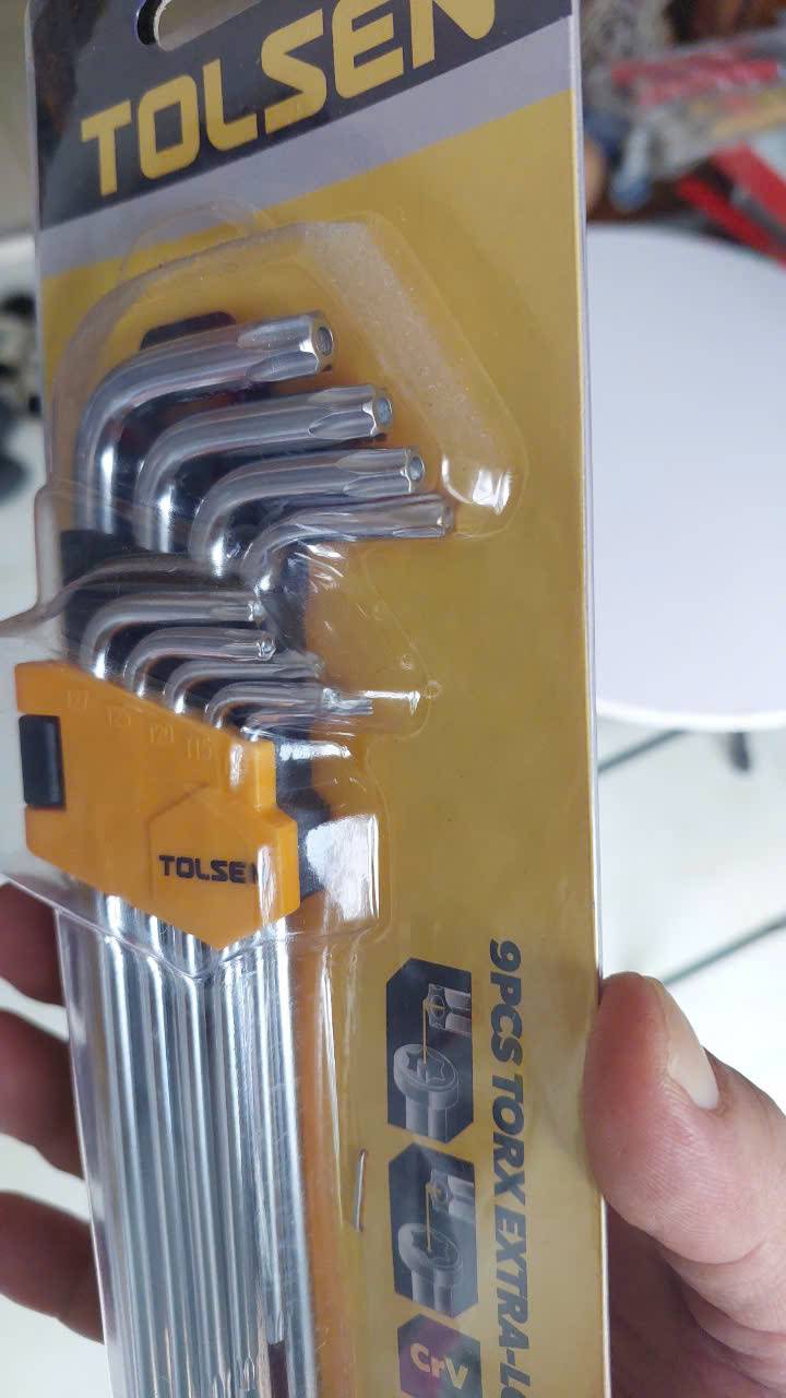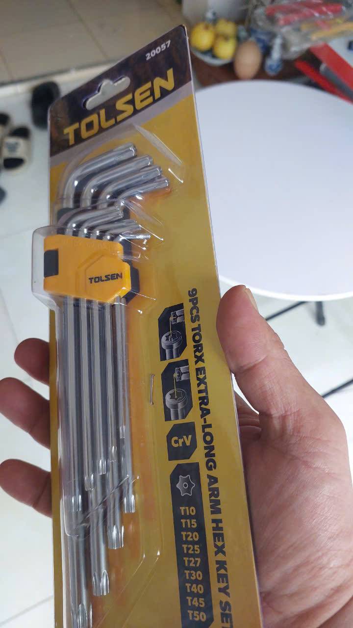 Bộ lục giác hoa thị dài Tolsen 20057 là một bộ dụng cụ gồm 9 cây làm bằng thép CrV chất lượng cao, được thiết kế để tháo lắp các loại vít có đầu hình sao (hoa thị/bông).