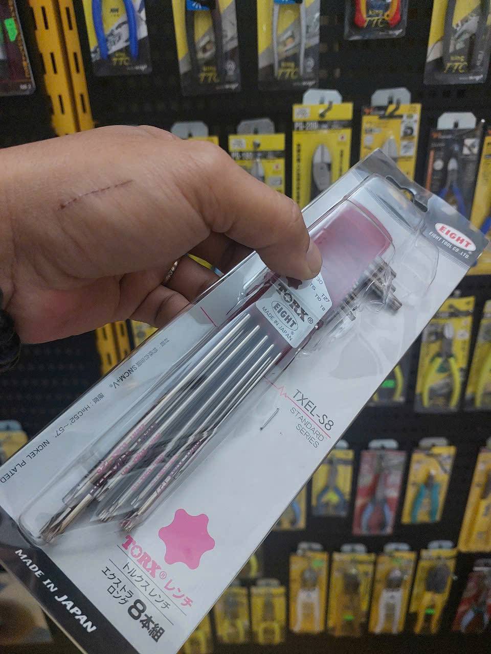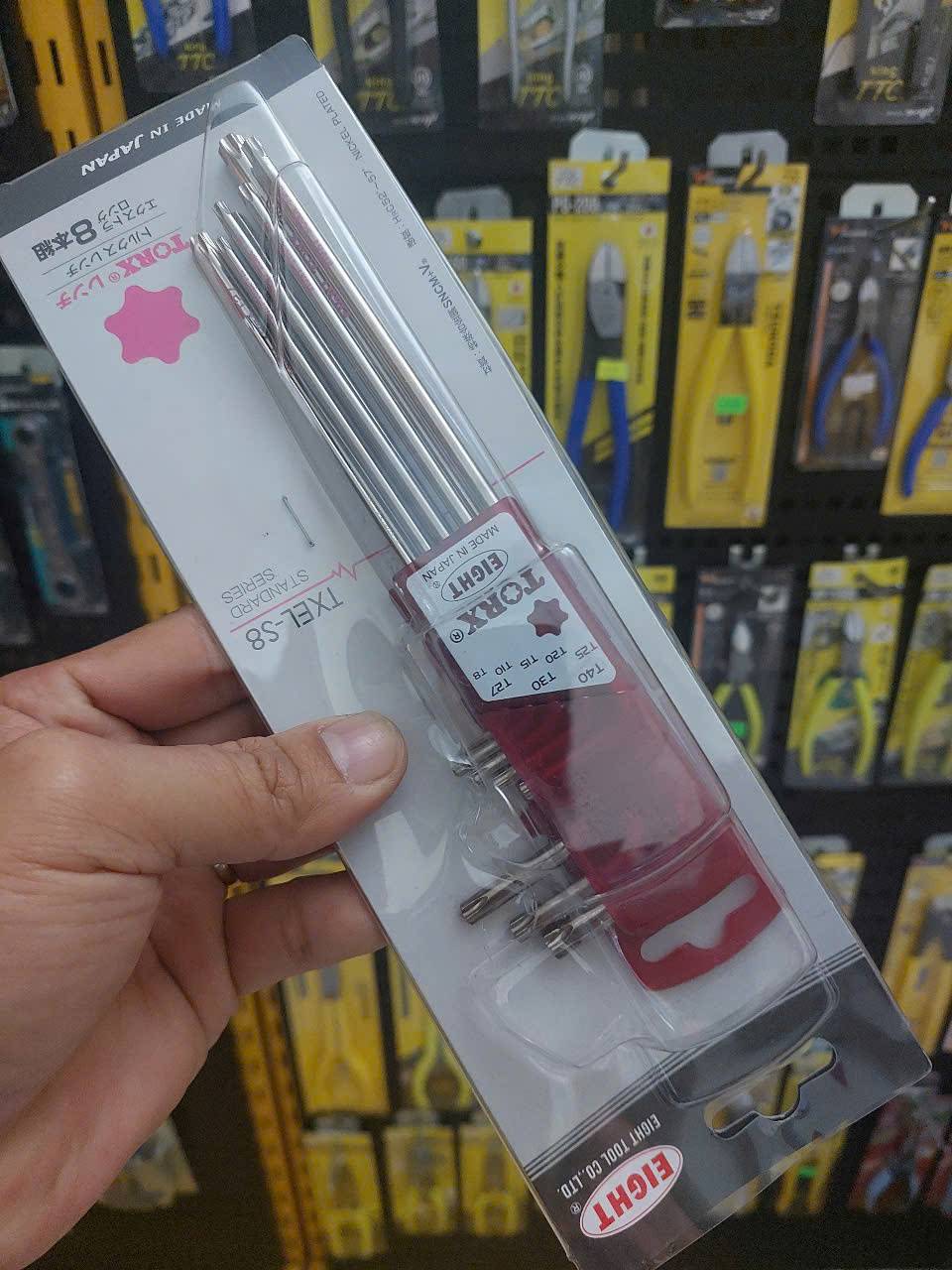 Bộ lục giác hoa thị Eight TXEL-S8 là bộ dụng cụ chất lượng cao gồm 8 chi tiết, kích thước từ T8 đến T40, được sản xuất tại Nhật Bản, nổi tiếng về độ bền và độ chính xác