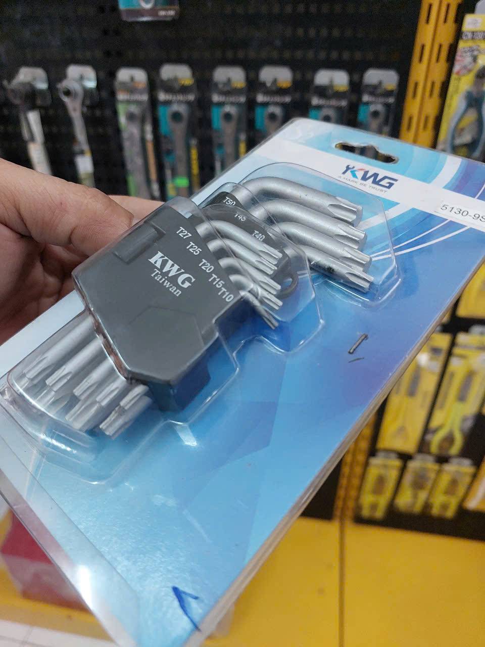 Bộ lục giác hoa thị ngắn 9 món KWG 5130-9SP là một bộ dụng cụ chuyên dụng, bao gồm các kích thước từ nhỏ đến lớn, được sử dụng để tháo/siết ốc vít có rãnh hình sao (Torx).