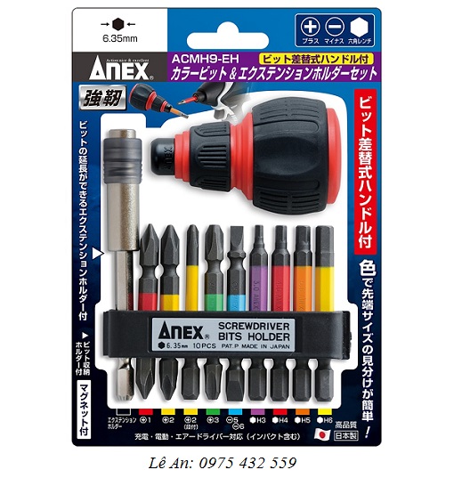 - Sản phẩm Bộ 9 mũi vít kèm Đầu nối vít và cán Anex ACMH9-EH được phân phối bởi công ty TNHH Thương Mại Lê An