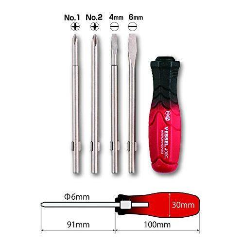 Bộ tô vít 4 mũi cán rời có túi đựng No.TD-2100 Vessel (Nhật Bản) Thành phần Tay cầm, 2 trục vít kép (tổng 4 đầu vít), túi vải đựng Mũi vít kép (+) Phillips #1, (+) Phillips #2, (-) Slotted 4mm, (-) Slotted 6mm Vật liệu trục Thép Chrome Vanadi, có từ tính, mạ niken chống gỉ Tay cầm Hình bát giác, làm từ nhựa Polypropylene (PP), chống trượt, chống dầu mỡ Kích thước Tổng chiều dài khi lắp trục: khoảng 191 mm; Chiều dài trục: 120 mm Trọng lượng Nhẹ, dễ cầm nắm