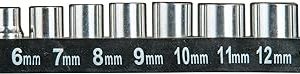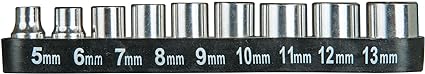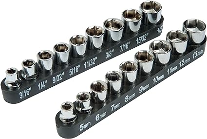 - 18 ống: 5mm, 6mm, 7mm, 8mm, 9mm, 10mm, 11mm, 12mm, 13mm, 3/16″, 7/32″, 1/4″, 5/16″, 11/32″, 3/8″, 7/16″, 15/32″, 1/2″