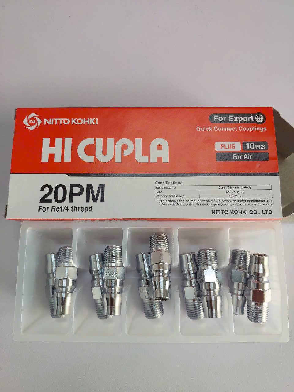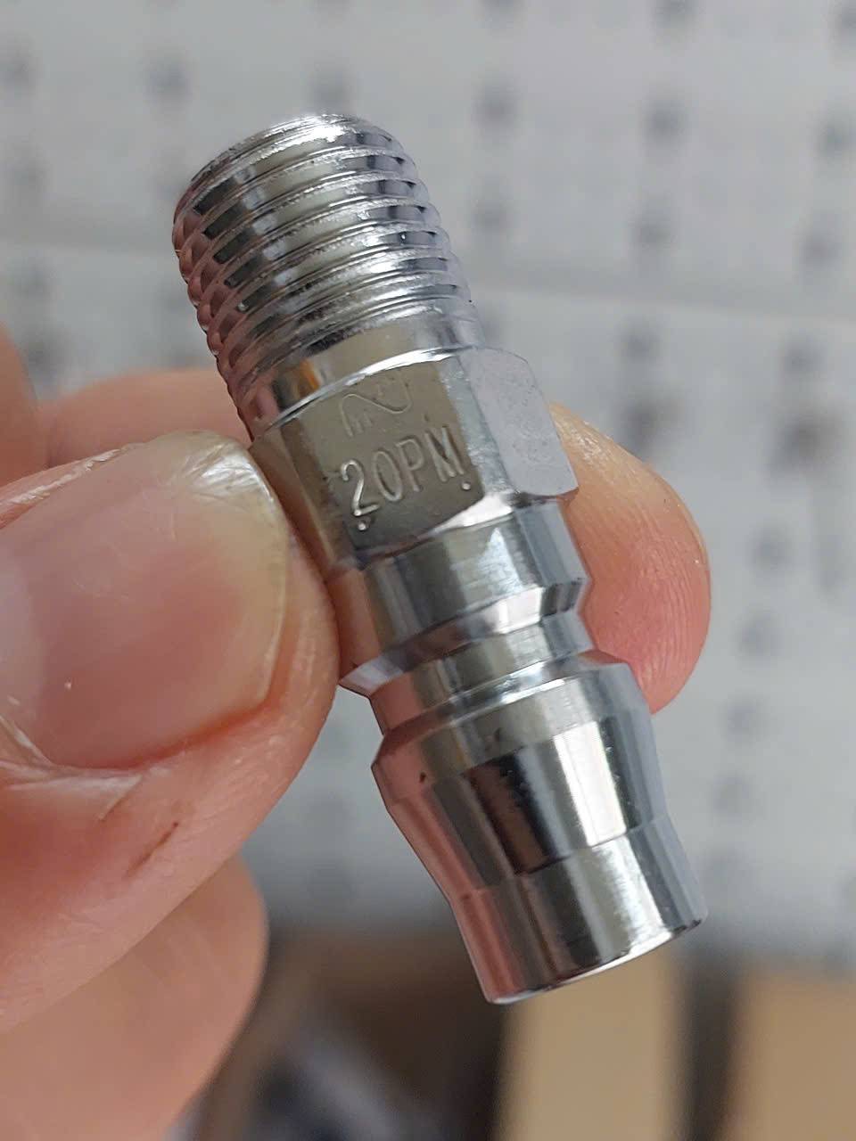 Đầu nối nhanh khí nén Nitto 20PM là một loại đầu nối đực (phích cắm) ren ngoài có kích thước tiêu chuẩn 1/4 inch, được sản xuất bởi thương hiệu Nitto Kohki nổi tiếng của Nhật Bản, chuyên dùng cho các hệ thống khí nén.