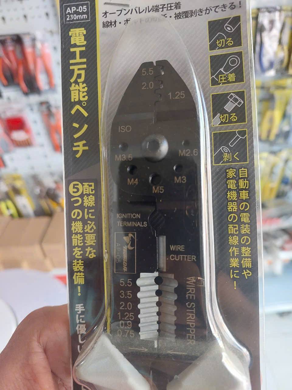 Kìm điện đa năng Tsunoda AP-05 là dụng cụ chuyên dụng từ Nhật Bản, tích hợp 5 chức năng trong 1 (5-in-1), chuyên dùng cho việc lắp đặt điện dân dụng và điện tử