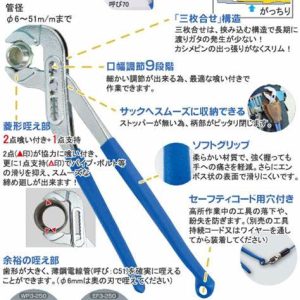 Kìm mỏ quạ Top Kogyo EF3-250 là sản phẩm cao cấp đến từ Nhật Bản. Phần miệng hình thoi rộng, có biên dạng răng lớn và có thể kẹp chắc chắn các ống thép mỏng (danh nghĩa: C51). Răng được làm cứng bằng cảm ứng và có khả năng chống mài mòn tuyệt vời. Phía cuối tay cầm Có lỗ luồn dây an toàn Ngăn chặn các công cụ bị rơi hoặc bị mất khi làm việc ở độ cao. Cấu trúc ba lớp được kẹp lại để tránh bị lỏng trong một thời gian dài!Mỏng mà không có các chốt hàn nhô ra! Việc mở miệng có thể được điều chỉnh theo 9 cấp độ và chiều rộng miệng tối ưu có thể được điều chỉnh theo công việc