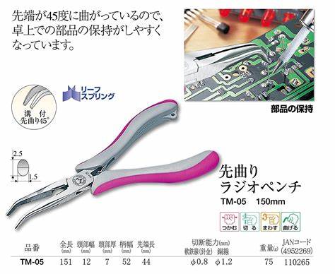 Kìm mũi cong 6 inch Tsunoda TM-05 là sản phẩm cao cấp đến từ Nhật bản. Kiểu mũi uốn cong thích hợp làm việc trên bàn làm việc. Kết cấu khớp hộp có tuổi thọ cao và độ bền cao. Chất liệu : Thép hợp kim đặc biệt. Tay cầm nhỏ gọn, đúc nhựa đàn hồi thoải mái. Được thiết kế để vừa lòng bàn tay của bạn, nó có trọng lượng cân bằng giúp bạn cảm thấy nhẹ nhàng trong tay và cải thiện đáng kể khả năng làm việc. Trang bị lò xo lá có thể điều chỉnh lực đẩy của lò xo tùy theo sở thích.