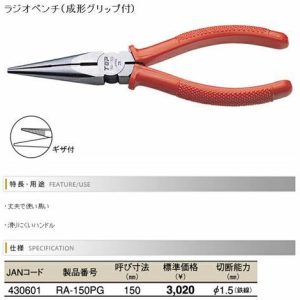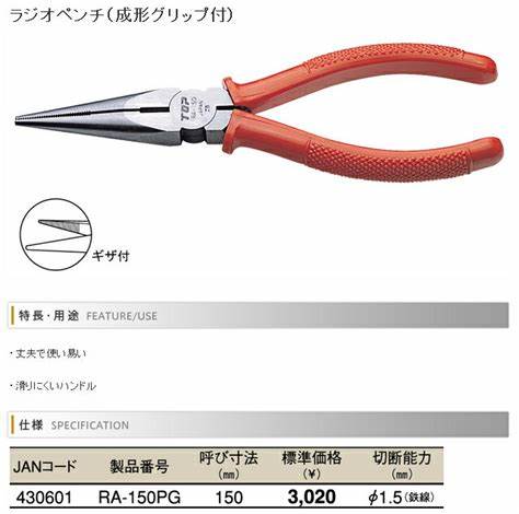 Kìm mũi nhọn Top Kogyo RA-150PG Là sản phẩm cao cấp đến từ Nhật Bản. Thiết kế nhỏ gọn Đầu bút mảnh mai thuận tiện cho việc làm việc trong không gian hẹp. Làm nguội cảm ứng duy trì độ sắc nét tuyệt vời. Sử dụng thép Cr-V cho độ bền cao. Đi kèm Với tay cầm đúc bền, chống trượt, dễ cầm. Lý tưởng cho công việc lắp ráp, sửa chữa và tháo gỡ liên quan đến dòng điện nhẹ. Cũng thích hợp để bảo trì và sửa chữa ô tô, máy móc, v.v… Giúp người dùng hoàn thành công việc một cách dễ dàng và hiệu quả hơn.