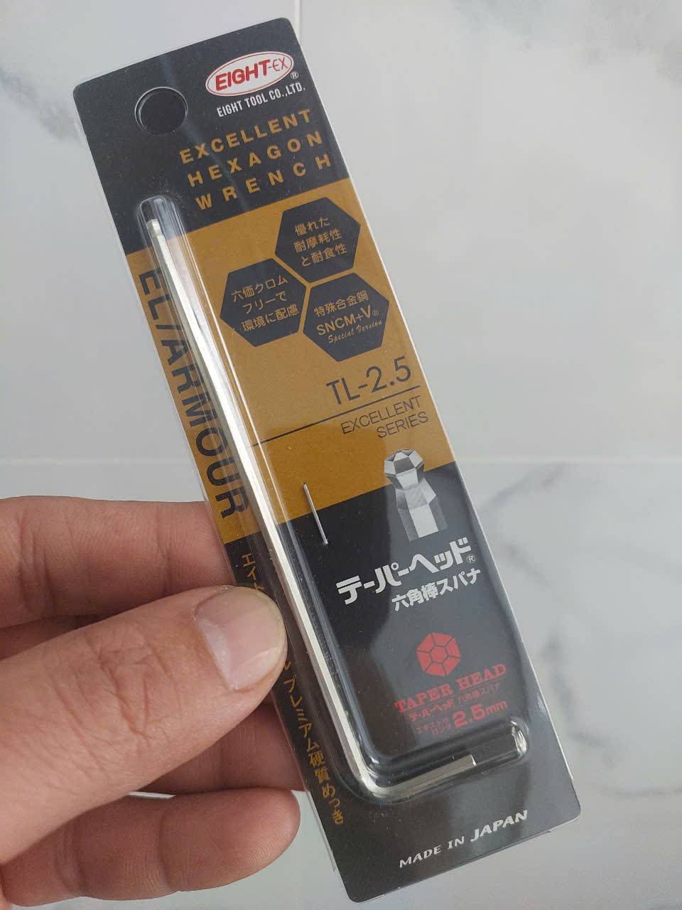 Lục giác bi NHẬT BẢN TL-2.5P EIGHT là một chiếc lục giác chữ L đầu bi 2.5mm chất lượng cao, được sản xuất tại Nhật Bản, làm từ thép hợp kim đặc biệt SNCM-V, và được bán lẻ trong vỉ nhựa tiện lợi