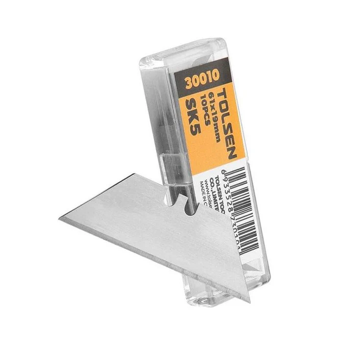 Lưỡi dao Tolsen 30010 là lưỡi dao rọc giấy chất lượng cao, thường được bán theo tép 10 lưỡi và được làm từ thép SK5 sắc bén. Sản phẩm này được thiết kế để sử dụng làm lưỡi dao thay thế cho các loại dao rọc giấy chuyên dụng của Tolsen.