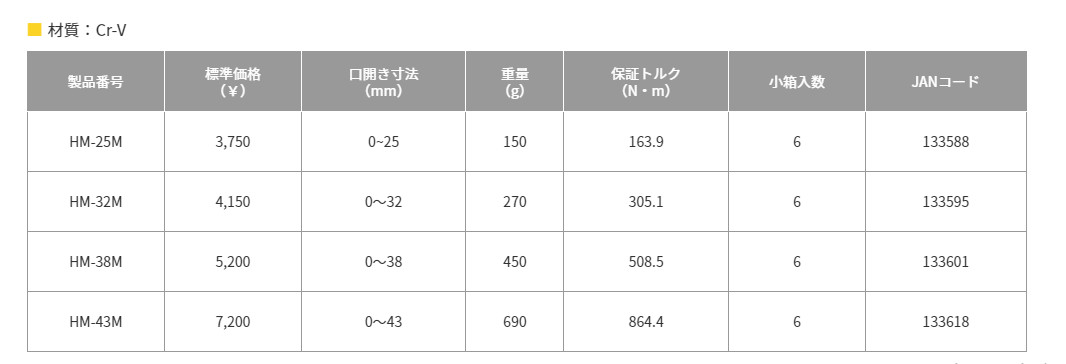 Đặc điểm Chi tiết Nguồn Thương hiệu Top Kogyo (Nhật Bản) Model HM-43M Kích thước mở hàm 0 ~ 43mm Đảm bảo mô-men xoắn 864.4 N.m Chiều dài 313mm Trọng lượng 690g Độ dày mũi 10mm Độ dày đầu 18.3mm Độ dày tay cầm 11.2mm