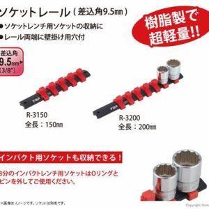 Ray giá đỡ tuýp (đỡ khẩu 3/8″) Top Kogyo R-3200 là sản phẩm cao cấp đến từ Nhật bản. Được làm bằng nhựa, siêu nhẹ trọng lượng 25g , số lượng 7 miếng kẹp màu đỏ, chiều dài 200 mm. Để lưu trữ ổ cắm cho cờ lê ổ cắm. Có lỗ treo tường ở hai đầu thanh ray. Đầu khẩu, đầu tuýp có thể được lưu trữ trong ổ cắm hay còn gọi là Ray giá đỡ .Truyền động vuông : 9,5mm cho đầu khẩu, đầu tuýp 3/8″. Với thiết kế nhỏ gọn giúp bạn bảo quản và cất giữ đầu khẩu , đầu tuýp kích thước 3/8″ một cách khoa học, dễ tìm, dễ kiểm soát, Chắc chắn sẽ làm bạn hài lòng khi sử dụng Ray giá đỡ tuýp thương hiệu Top Kogyo.