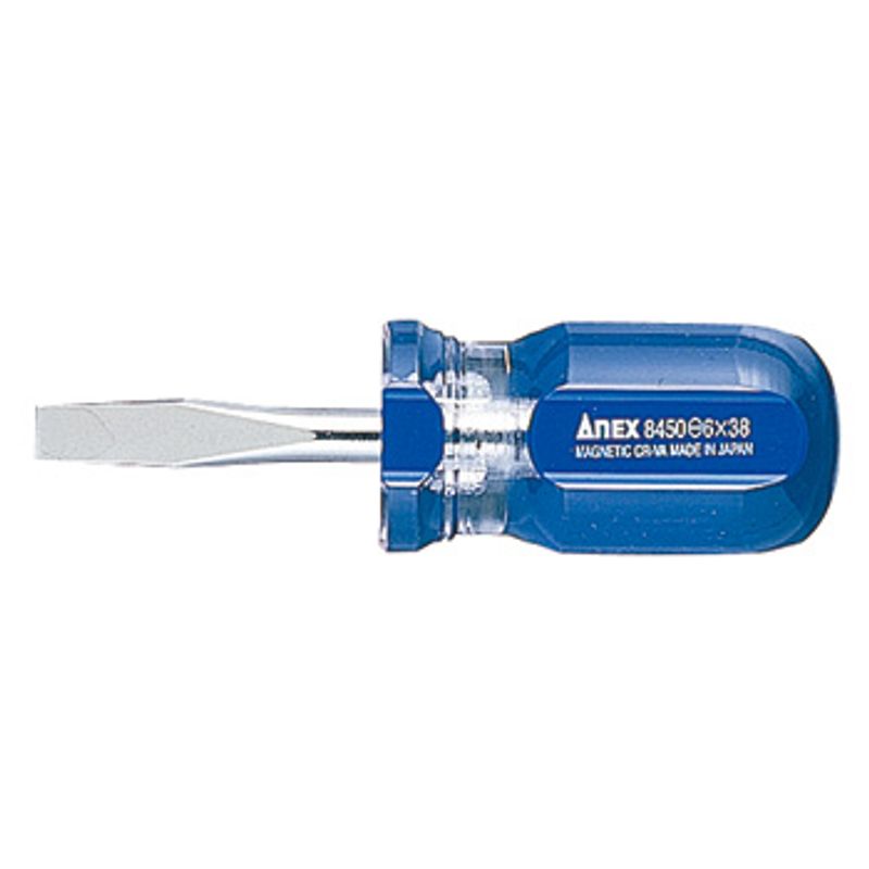 Tô vít cán trong loại ngắn Anex No.8450-6×38 là một dụng cụ cầm tay chất lượng cao từ Nhật Bản, được thiết kế đặc biệt cho các công việc trong không gian chật hẹp. Sản phẩm này có đầu dẹp (-) kích thước 6 mm, chiều dài trục 38 mm và tổng chiều dài là 85 mm, với tay cầm bằng nhựa acetate bền bỉ và có từ tính
