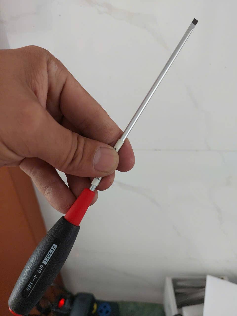 - Đầu vít: Đầu dẹp (slotted) kích thước 4 mm, có độ chính xác cao (black point tip) giúp bám chặt vào rãnh vít và không bị ảnh hưởng bởi độ dày lớp mạ, theo thông tin từ nhà sản xuất Vessel.