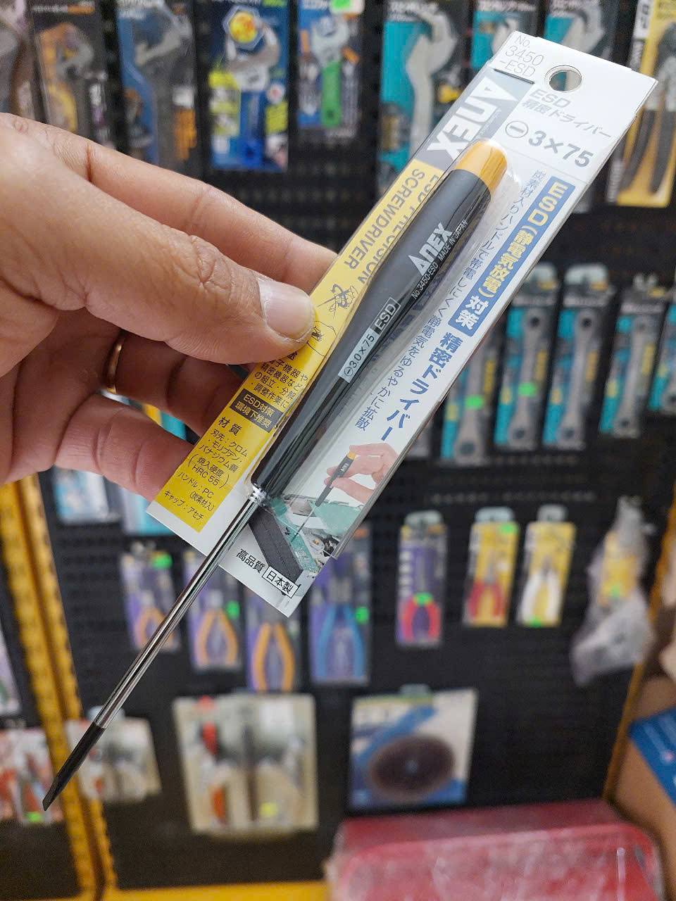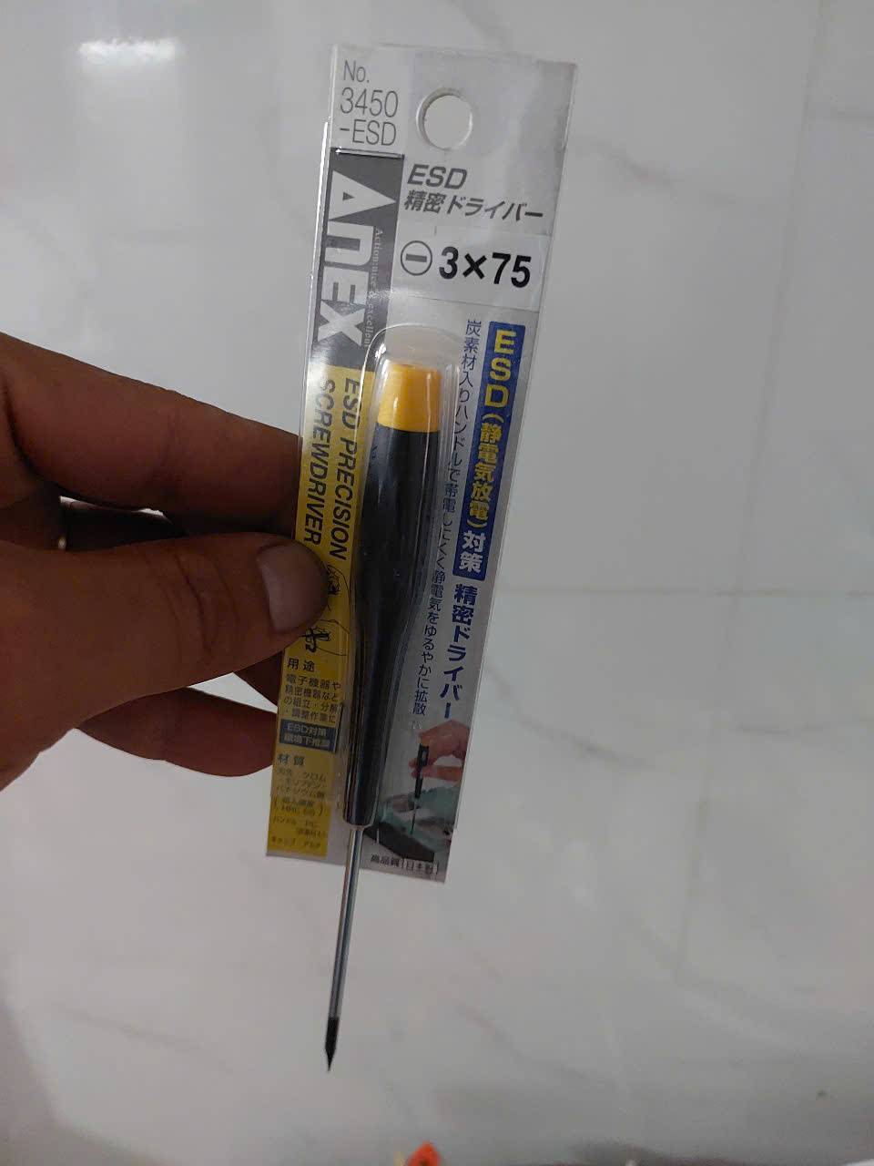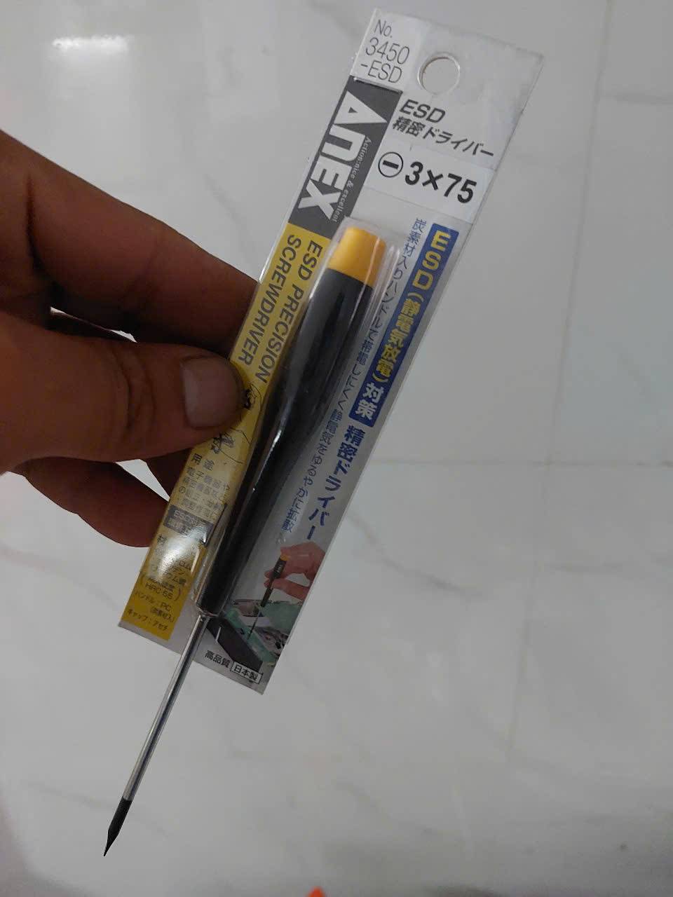 Thuộc tính Chi tiết Thương hiệu Anex Xuất xứ Nhật Bản Loại đầu vít Đầu dẹp (minus/flathead) Kích thước đầu vít 3.0 mm (chiều rộng) x 0.45 mm (chiều dày) Chiều dài thân vít 75 mm Tổng chiều dài 169 mm Vật liệu thân vít Thép Chrome Molypden Vanadi Vật liệu tay cầm PC (Polycarbonate) chứa than hoạt tính, có khả năng tản điện tĩnh Khả năng chống tĩnh điện Tay cầm chứa than giúp ngăn ngừa tích tụ tĩnh điện và tản điện nhẹ nhàng, bảo vệ mạch điện bên trong. Tiêu chuẩn RoHS2