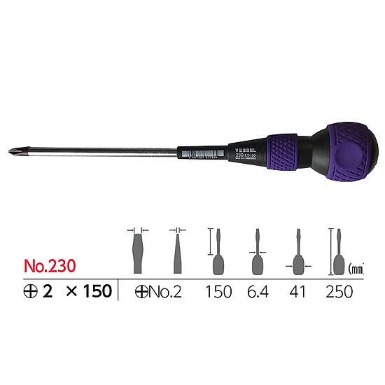 Tô vít đóng 4 cạnh cán tròn Vessel 230(Ph No.2 x 150) - Đường kính tay cầm 41mm