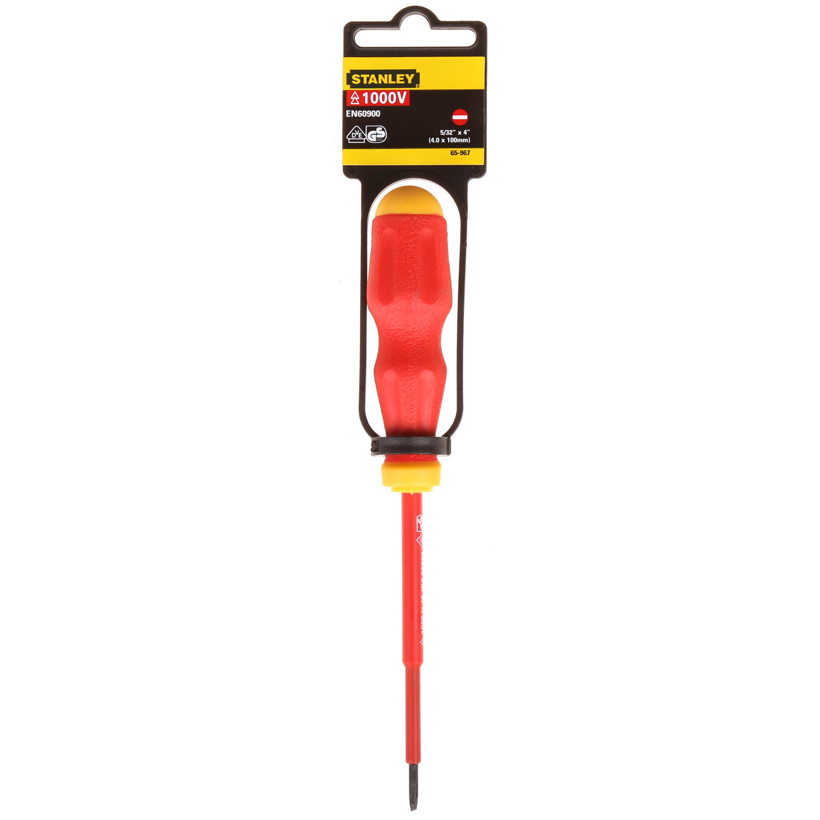 Tuốc nơ vít 2 cạnh cách điện VDE Stanley 65-967 4mmx100mm. Được thử nghiệm riêng lẻ ở điện áp 1000V đều vượt tiêu chuẩn ISO/DIN . Vật liệu: lưỡi Chrome vanadi được xử lý nhiệt để truyền mô-men xoắn tối đa. Tay cầm tiện dụng, chống sốc, chống trượt và cho mô-men xoắn lớn hơn . Giúp thao tác dễ dàng mang lại hiệu quả công việc cao.