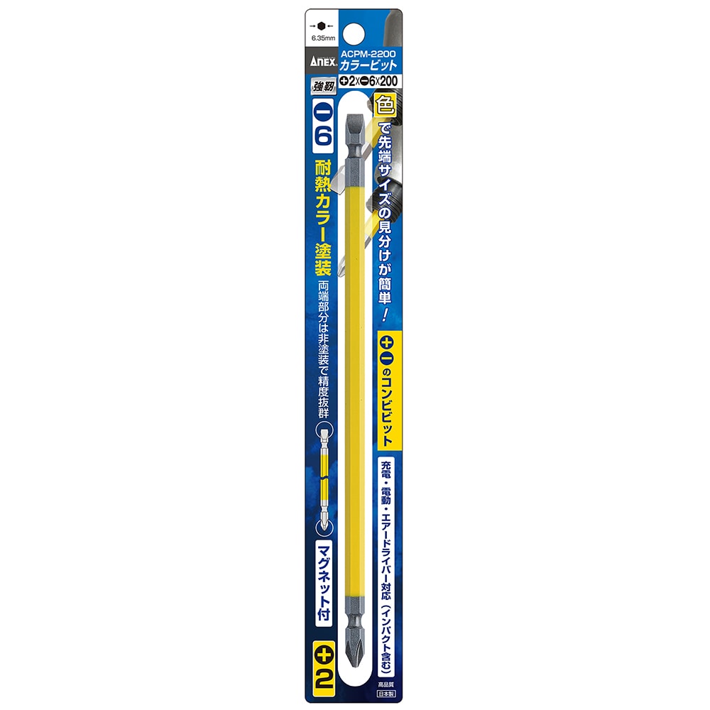 Vỉ 1 mũi vít 2 đầu có từ tính Anex ACPM-2200 Là sản phẩm cao cấp đến từ Nhật bản. Dễ dàng để phân biệt kích thước đầu bằng màu sắc. Loại hai đầu loại kết hợp có cả đầu âm (-6) và dương (+2). Cả hai đầu đều không sơn có độ chính xác vượt trội và để phần sơn không cản trở khi gắn tuốc nơ vít điện. Dụng cụ được sử dụng cho máy bắt vít để siết chặt và nới lỏng các vít và bu lông. Giúp người dùng hoàn thành công việc dễ dàng, nhanh chóng và hiệu quả.