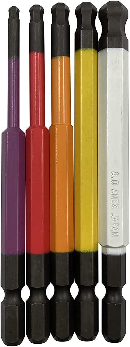 Vỉ 5 mũi vít đầu lục giác bi Anex ACBP5-100L Là sản phẩm cao cấp đến từ Nhật bản. Mỗi vít được sơn một màu khác nhau để dễ dàng phân biệt kích thước của đầu bằng màu sắc. Đầu bi có thể nghiêng và xoay. Cả hai đầu đều không sơn với độ chính xác tuyệt vời của đầu và không cản trở khi gắn tuốc nơ vít điện. Dụng cụ được sử dụng cho máy bắt vít để vặn các vít có đầu lục giác và bu lông đầu lục giác.